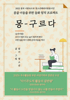 (순천=뉴스코리아) 첼문 기자 = 서울시립청소년문화교류센터(미지센터)는 5월 2일(월)부터 23일(월)까지 2022 여성가족부 ‘꿈과 사람속으로’ 청소년해외자원봉사단 ‘몽구르다’ 프로그램에 참여할 청소년을 모집한다.참가 대상은 전국의 만 15~24세 청소년이며, 사회적 배려 청소년 지원자에게는 서류 심사 시 가점을 부여한다.참가 청소년들은 7월 2일(토) 사전 교육을 시작으로 총 6회기의 온·오프라인 활동을 통해 몽골 아동을 위한 창작 동화책을 만들어 전달할 예정이다. 현직 동화 작가와 멘토링을 통해 동화 줄거리부터 삽화, 디자인