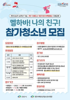 (뉴스코리아=천안) 최성민 기자 = 천안시 태조산 청소년 수련관(관장 윤여숭)은 오는 11일까지 천안시와 자매도시인 튀르키예 뷰첵메제시와 상호 교류 활동에 참여할 총 10명의 17~19세 천안시 청소년을 모집한다. 튀르키예 뷰첵메제시는 2009년부터 천안시와 교류를 시작했고 2013년에 정식으로 협약을 체결한 후, 현재 까지도 우호관계를 유지하고 있으며 상호 교류와 방문을 지속하고 올해는 청소년 간 상호 교류를 진행한다. 윤여숭 관장은 "천안시와 자매도시인 튀르키예 뷰첵메제시 청소년들이 서로의 문화를 이해하고 글로벌 시민으로서 성장