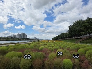 (뉴스코리아=아산) 김소연 기자 = 충청남도 아산시 곡교천 은행나무길 일대가 형형색색의 가을꽃으로 물들며 시민과 관광객들의 발길이 이어지고 있다. 10월 초 현재 곡교천변에는 연분홍·자주·보라·흰색의 코스모스가 바람에 흩날리며 한 폭의 수채화를 이루고, 그 사이로 진분홍·주황·보라빛 백일홍이 화려한 색감을 더해 가을 정취를 한층 짙게 하고 있다. 노랗게 물들기 시작한 은행나무길과 어우러진 풍경은 ‘가을 아산’을 대표하는 절경으로 손꼽힌다. 산책로 곳곳에는 귀여운 눈모양 장식물이 설치돼, 방문객들이 꽃밭 사이에서 사진을 찍으며 즐길
