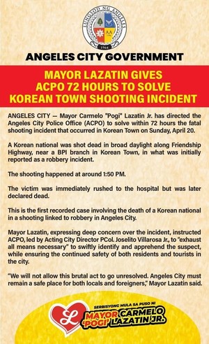 (뉴스코리아=앙헬레스) 황장익 특파원 = 현지시간 20일(일) 필리핀 앙헬레스 시에서 발생한 2인조 오토바이 총기 강도 사건으로 인해 한국인 관광객이 사망하자 현지 한인 사회가 침통함에 빠졌다. 이에 한인사회에서는 자발적으로 희생자 추모를 위한 추모공간을 마련하는등, 한인들의 희생자 추모행렬이 이어지고 있다.해당 추모공간은 당시 총상을 입은 희생자를 구급차가 도착할때까지 심폐소생술을 하며 최선을 다해 도왔던 현지 동포 K 씨가 고인을 추모할수 있는 공간을 사건 현장에 국화를 분향 하면서 시작됐다. 이에 한인 동포 단체 대화방에서는