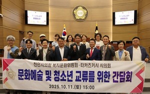 (뉴스코리아=천안) 김현미 기자 = 충청남도 천안시의회 복지문화위원회(이종만 위원장)는 10월 11일(토)에 일본 타카츠키시의회 의원 등을 초청해 양 도시 간 문화교류 및 청소년 분야 협력 방안을 논의하는 간담회를 개최했다.이번 간담회는 천안시의회 복지문화위원회 이종만 위원장과 류제국 부의장의 주관으로 ▲박종갑 부위원장, ▲엄소영 의원, ▲유영진 의원, 행정보건위원회 ▲이상구 의원이 함께 참석했으며, 타카츠키시의회에서는 ▲마나베 소우이치로 의원, ▲키타가와 준이치로 조직위원장을 비롯한 관계자들이 함께해 문화·예술·청소년 분야 협력