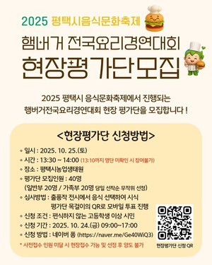 (뉴스코리아=평택) 이창주 기자 = 경기도 평택시(시장 정장선)가 오는 25일(토) 농업생태원에서 ‘2025 평택시 음식문화축제’를 성대하게 개최하며, 시민들에게 K컬처의 창의성과 글로벌 미식의 풍성함을 동시에 선사할 예정이다. 이번 축제는 다문화 화합과 지역 경제 활성화를 목표로 다채로운 프로그램과 체험 부스를 선보인다.축제의 하이라이트인 전국 요리경연대회는 ‘평택의 맛, 나만의 아이디어로 버거를 완성하다’를 주제로 펼쳐진다. 총 18팀(일반부 10, 가족부 8)이 본선에 진출해 평택의 특색을 살린 재료와 아이디어를 더해 글로벌