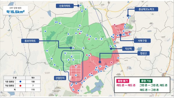 이번에 확대된 구간은 충남테크노파크, 상덕리, 마정리, 양당리 등 7.5㎢, 정류장 26개소로 총 15.5㎢, 115개소 정류장에서 콜버스 이용이 가능하다.
