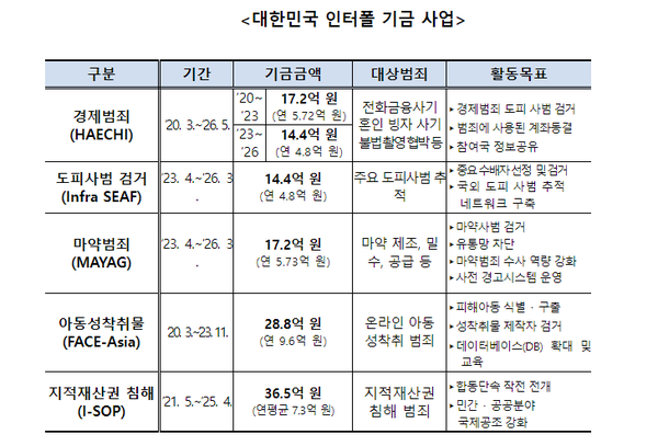 경찰청은 2020년 3월부터 매년 총 15억 상당의 인터폴 기금을 주도하고 있으며, 이를 통해 마약·금융범죄·성착취범죄 대응 및 도피사범 검거 등 다양한 초 국경 범죄 분야에 이바지하고 있다.