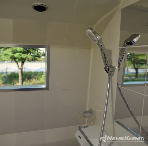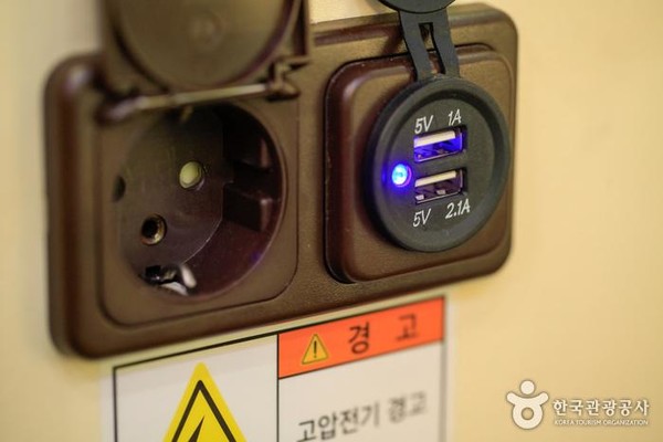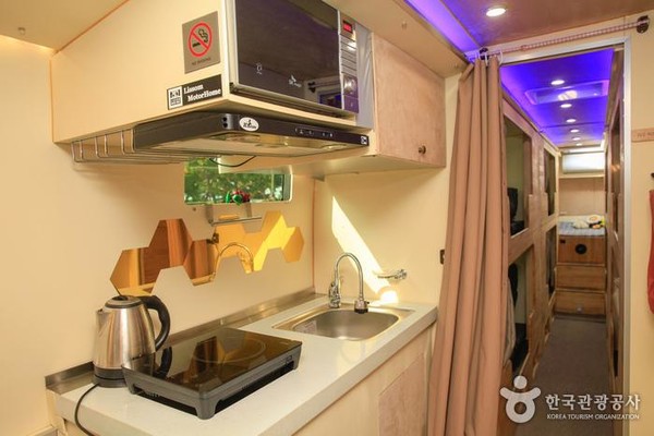 인덕션 레인지와 전자레인지, 전기포트가 놓인 조그만 싱크대에서는 간단한 조리가 가능하다. 음식물을 보관할 150리터 냉장고도 트렁크에 마련되어 있어 음료수와 주류를 미리 준비하면 냉장고에 비치해서 시원하게 마실수 있다. 변기와 샤워기를 갖춘 욕실에도 작은 창이 나 있다. 창밖을 보며 샤워할 수 있도록 특별히 주문해 만든 것이다. 게스트하우스 버스에서 사용하는 전기는 지붕에 설치된 태양광 발전시스템을 통해 공급받는다.