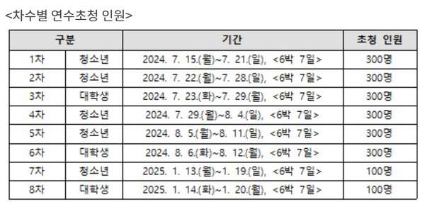 ‘2024년 재외동포 차세대 모국 연수’는 총 8회에 걸쳐 각 6박 7일 일정으로 실시한다. 이번 연수에는 전년 1천307명 대비 53% 늘어난 차세대가 참여할 계획이다. 청소년 1천300명과 대학생 700명이 모국을 찾는다.