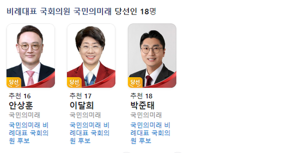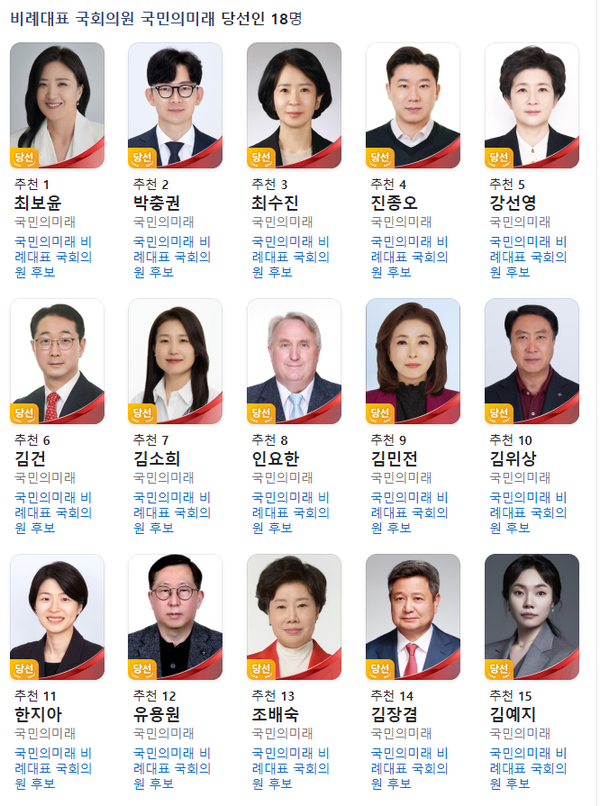 다음은 국민의미래 비례대표 당선인의 명단이다. 최보윤, 박충권, 최수진, 진종오, 강선영, 김건, 김소희, 인요한, 김민전, 김위상, 한지아, 유용원, 조배숙, 김장겸, 김예지, 안상훈, 이달희, 박준태, 총 18석을 차지했다.