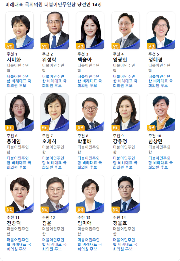 다음은 더불어민주연합 비례대표 당선인의 명단이다. 서미화, 위성락, 백승아, 임광현, 정혜경, 용혜인, 오세희, 박홍배, 강유정, 한창민, 전종덕, 김윤, 임미애, 정을호, 총14석을 차지했다.