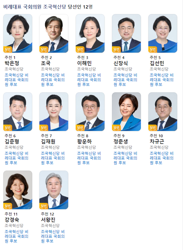 다음은 조국혁신당 비례대표 당선인의 명단이다. 박은정, 조국, 이해민, 신장식, 김선민, 김준형, 김재원, 황운하, 정춘생, 차규근, 강경숙, 서왕진, 총12석을 차지했다.