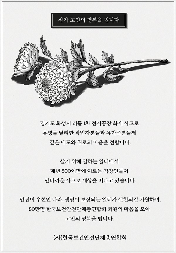 (뉴스코리아=서울) 김정호 기자 = 2024년 6월 24일 오전 10시 31분경 화성시 서신면 전곡리 산업단지에 있는 리튬전지 제조업체 ‘아리셀’의 공장 11채 중 3동 2층에서 ‘펑’ 하는 폭발음과 함께 발생했다.