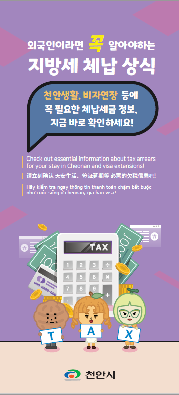 이 안내문에는 지방세 세목별 개요, 외국인이 체납할 경우 얻을 불이익과 편리한 납부방법 등이 포함되어 있으며 시청, 구청, 천안시다문화가정지원센터, 읍면동 행정복지센터 등 외국인 방문이 잦은 곳에 배포했다.