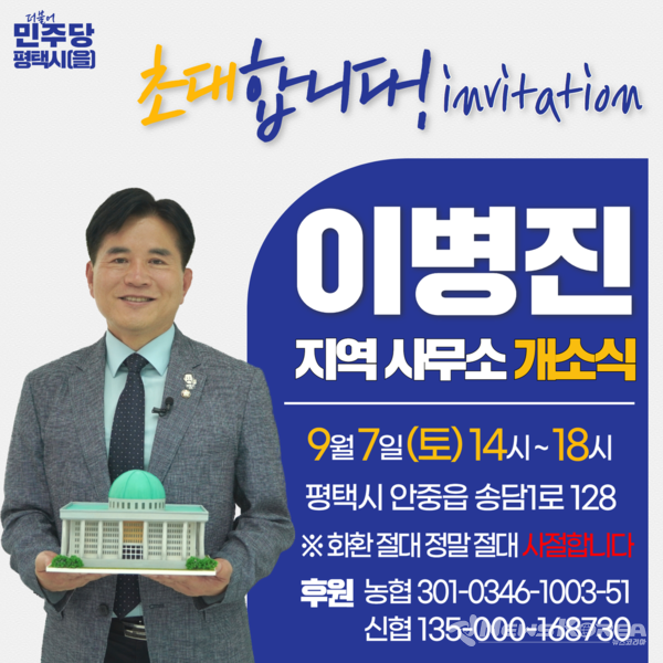 (뉴스코리아=평택) 김성덕 기자 = 더불어민주당 이병진 국회의원(평택시을)이 오는 9월 7일 (토) 오후 2시 , 경기도 평택시 안중읍 송담1로 128, 2층에 위치한 지역사무소에서 개소식 갖는다.