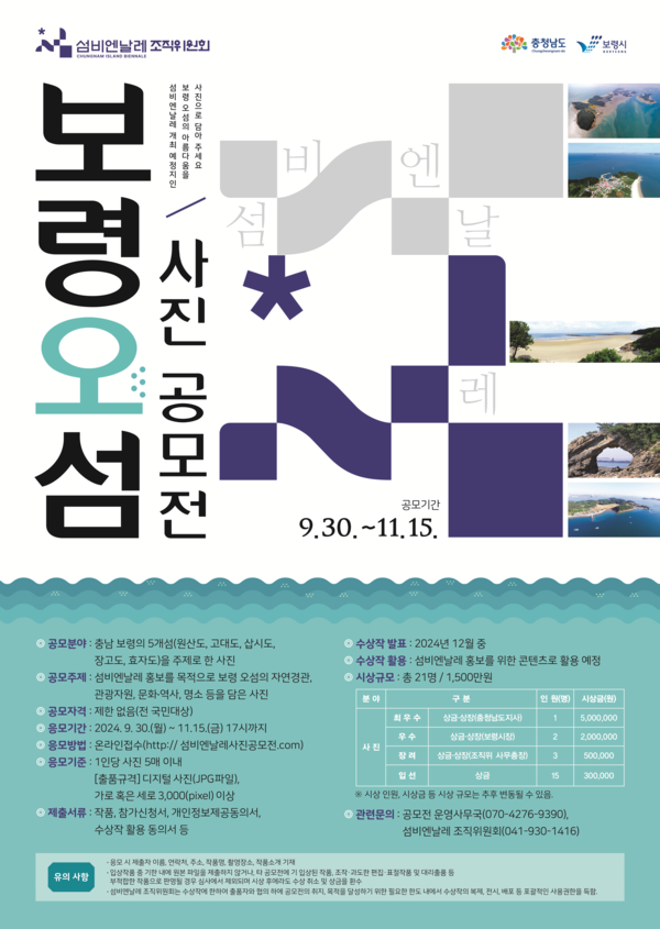 이번 사진 공모전은 섬비엔날레 개최 예정지인 보령의 오섬 관광에 관심 있는 국민 누구나 응모할 수 있으며, 오섬의 자연경관, 관광자원, 역사․문화 명소, 나만 알고 있는 숨은 명소 등을 담으면 된다.