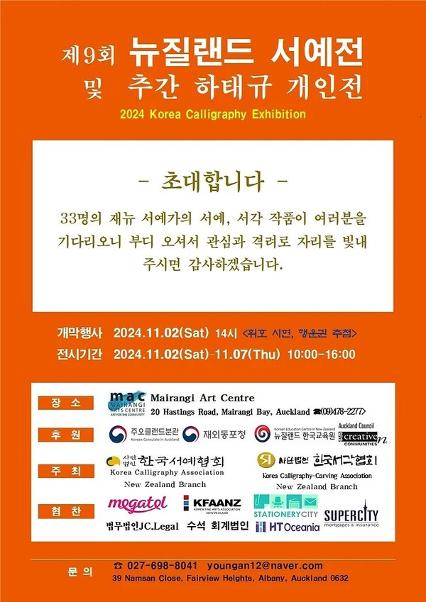 (뉴스코리아=오클랜드) 안기종 특파원 = 뉴질랜드 서예협회(회장 김영안)는 제9회 뉴질랜드 서예대전이 현지시간으로 오는 11월 2일 토요일 오후 2시 오클랜드 Mairangi Arts center (20 Hastings Road, Mairangi Bay)에서 개막한다고 밝혔다.