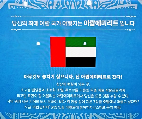 한편, 매년 아랍문화제 행사에 참여하고 '야나트립'은 올해 서울-아부다비 왕복 항공권, 아부다비 5성급 호텔 2박 숙박권, 아부다비 페라리월드 테마파크 입장권 제공하는 SNS이벤트로 아랍문화제를 풍성하게 만들 예정이다.