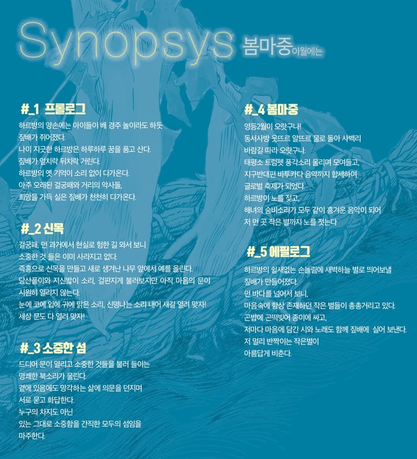 <봄 마중>공연은 과거 젊은시절의 삶의 양식과 패턴을 간직하고 살아가는 하르방이라는 존재를 마주하게 된다. 하르방은 주변의 친근한 것들이 점점 사라지고, 변해가는 세상에서 홀로 우직하게 지키는 삶을 살아간다. 이런 하르방이라는 존재를 통해 아직은 유효한 삶의 가치들에 대해 만나게 되고, 이는 신을 맞이하기 위한 봄마중을 떠날 수 밖에 없는 연유이기도 하다.