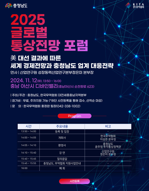 충청남도와 한국무역협회가 공동 개최하는 이번 포럼은 ‘미국 대선 결과에 따른 세계 경제 전망과 충청남도 업계 대응 전략’을 주제로 한다.