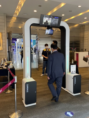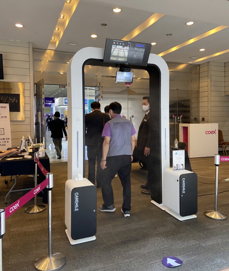 케어마일은 자체 브랜드로 새롭게 출시한 ‘퓨리드 게이트(CM-MG01)’를 전시했다. 퓨리드 게이트는 건물 출입자에 대한 자동 발열 체크 및 통과형 살균 소독이 동시에 가능한 방역 게이트다.