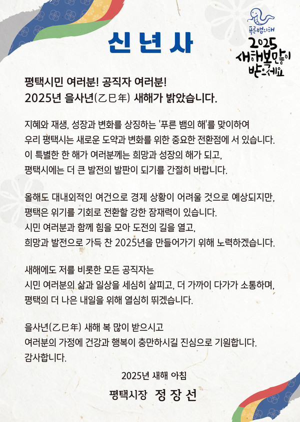 (뉴스코리아=평택) 김성덕 기자 = 1일 정장선 평택시장이 신년사를 발표했다. 정 시장은 신년사에서 "올해도 대내외적인 여건으로 경제 상황이 어려울 것으로 예상되지만, 평택은 위기를 기회로 전환할 강한 잠재력이 있다."면서, "새해에도 모든 공직자들이 시민들의 삶과 일상을 세심히 살피고 평택의 더 나은 내일을 위해 최선을 다하겠다."고 전했다. 다음은 정장선 평택시장의 신년사 전문 이다.