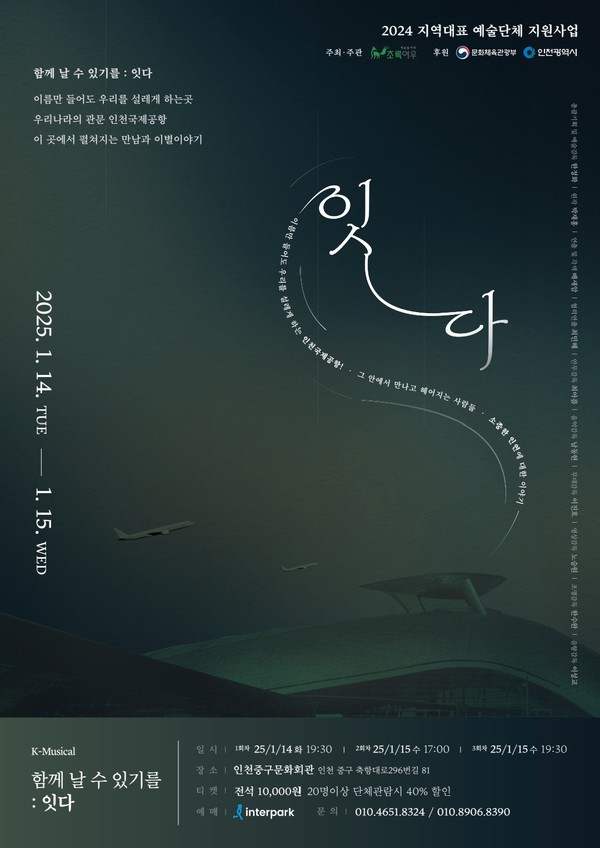 (뉴스코리아=인천) 박지혜 기자 = 예술놀이터 초록여우(대표 : 한정화)가 2025년 1월 14일(화) 17:00 ~ 15일(수) 17:00, 19:30(총 3회) 인천중구문화회관에서 <K-뮤지컬 함께 날 수 있기를 : 잇다> 를 진행한다.