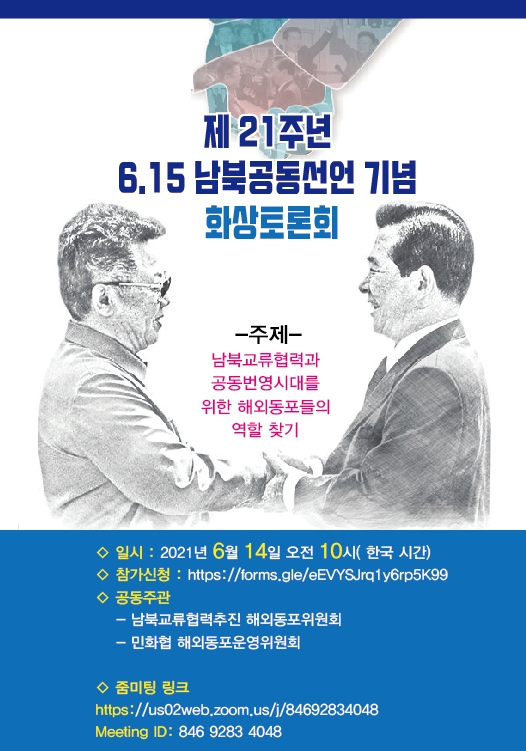 (서울=뉴스코리아) 문대진 기자 = 6.15 남북공동선언 21주년을 기념하는 화상토론회가 남북교류협력추진 해외동포위원회와 민화협 해외동포운영위원회가 공동주관하여 이종걸 민화협 의장, 한명숙 전 총리, 정연진 AOK 대표 그리고 정광일 재외동포재단 사업이사 외 재외동포 150여명이 참여하여 향후 남북화합과 통일을 어떻게 이뤄가면 좋을것인가에 대해 약 2시간여동안 토론이 줌을 통해 화상으로 진행이 되었다.