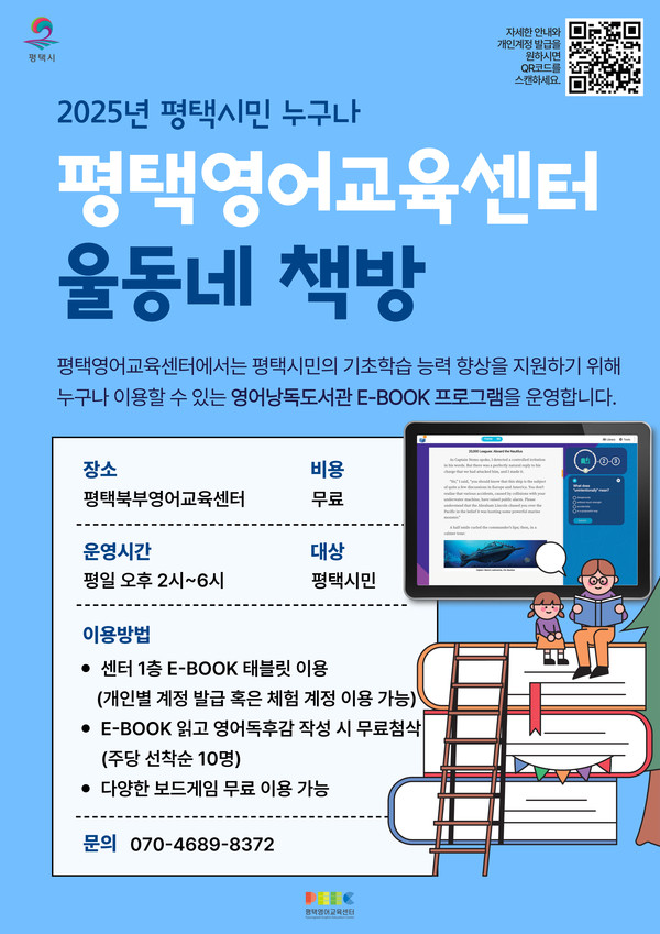 (뉴스코리아=평택) 김성덕 기자 = 평택시 국제교류재단 평택영어교육센터가 시민들의 영어 학습 기회를 확대하고 기초학습 능력 향상을 지원하기 위해 ‘울동네 책방’ 프로그램을 3월부터 12월까지 운영한다. 본 사업은 영어 독서를 보다 쉽고 친숙하게 접할 수 있도록 전자책(E-BOOK)을 활용한 영어낭독도서관 형태로 운영된다.