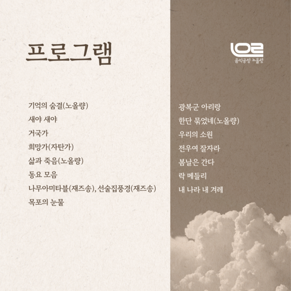 이번 공연은 새야 새야, 나무아미타불(재즈송), 목포의 눈물, 우리의 소원, 전우여 잘자라, 내 나라 내 겨레 등 과 더불어 음악공장 노올량의 기억의 숨결, 삶과 죽음, 한단 묶었네 를 함께 진행해 공연의 감성을 더할 예정이다.
