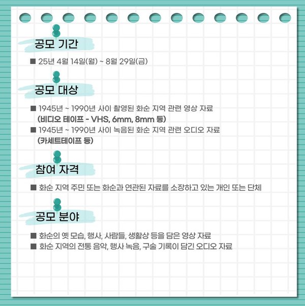 1. 공모 대상 자료 : 화순 지역의 옛 자연, 행사, 군민 생활상, 지역 전통문화 등이 담긴 내용으로1990년 이전의 동영상 영상 8㎜, 6㎜ 비디오 테이프(VHS)