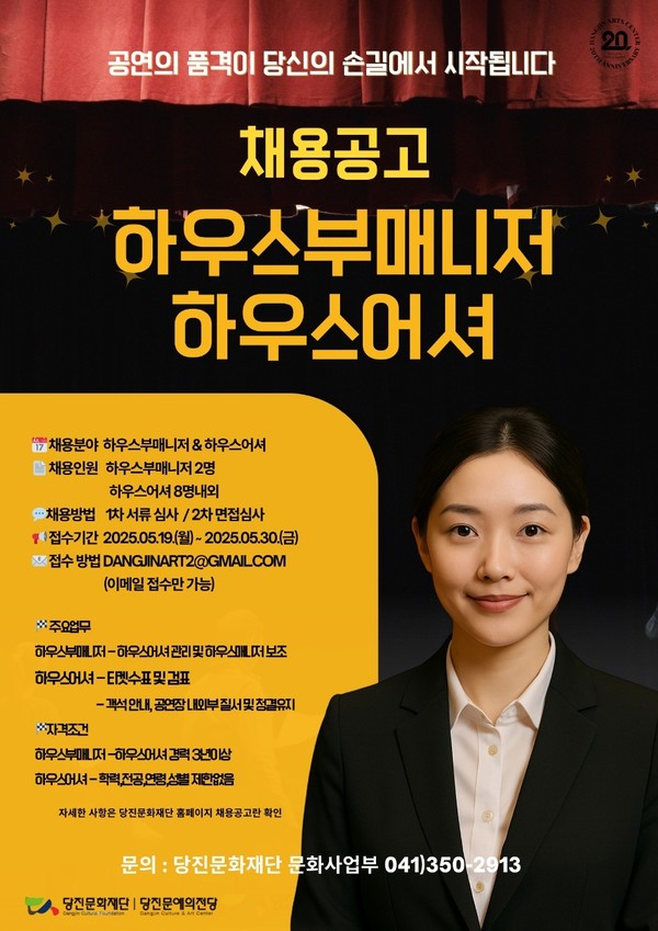 이번 채용은 당진문예의전당 현장 운영을 담당할 인력을 선발하는 것으로, 하우스부매니저 2명과 하우스어셔 8명 내외를 모집할 예정이다.
