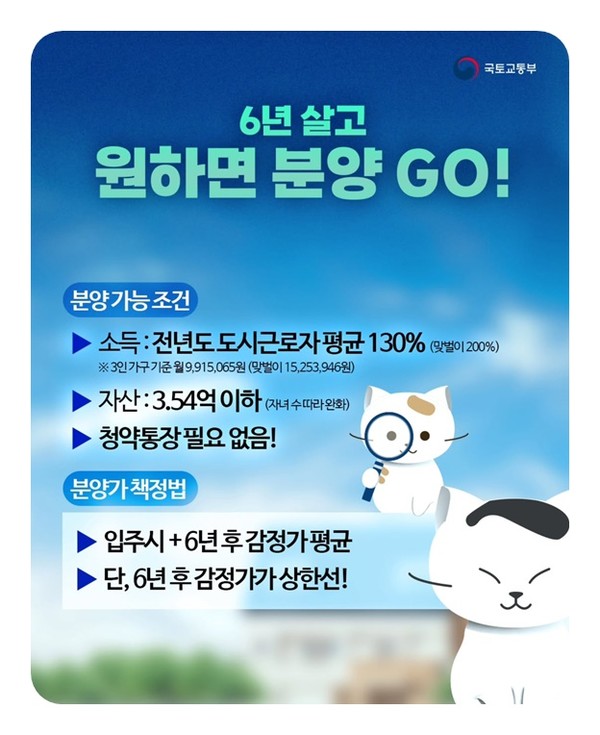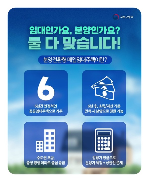 (뉴스코리아=서울) 최신 기자 = 분양전환형 매입임대주택이란?, 6년 간 안정적인 공공임대주택으로 거주한 후, 소득/자산 기준 만족 시 분양으로 전환이 가능한 주택을 말한다.