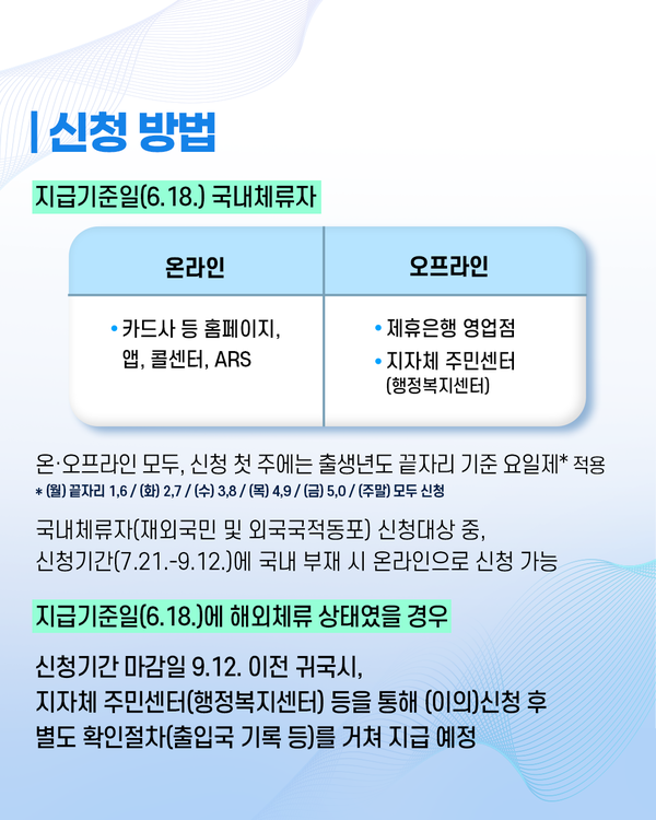지급기준일(6.18)에 해외체류 상태였을 경우라면 신청기간 마감일인 9.12. 이전 귀국시, 지자체 주민센터(행정복지센터) 등을 통해 (이의)신청 후 별도 확인절차(출입국 기록 등)를 거쳐 지급이 가능하다.