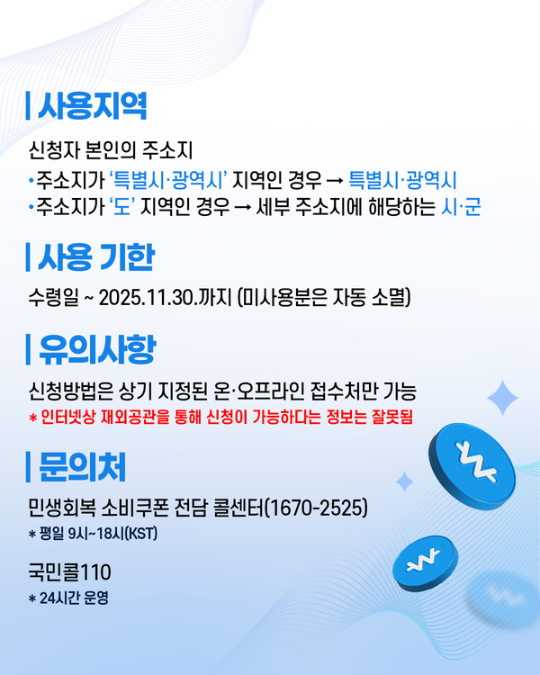 그외 자세한 내용은 민생회복 소비쿠폰 전담 콜센터 1670-2525(한국시각 기준 평일 오전 9시 ~ 오후 6시)나 국민콜 110(24시간 운영)을 통해 문의 하면 된다.