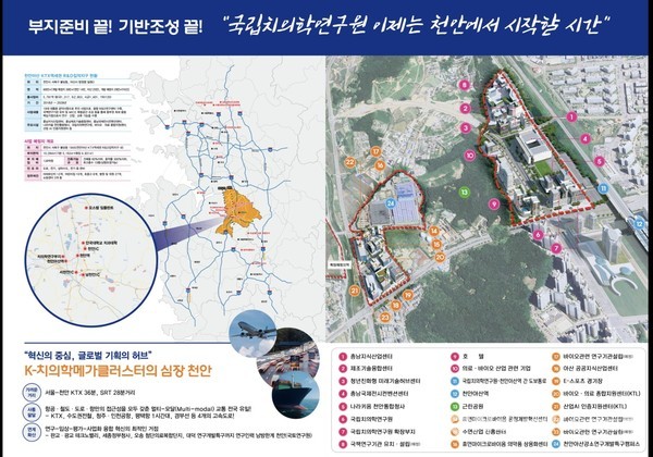 천안·아산 일대에는 단국대 치과대학병원, 순천향대병원, 단국대 치의학연구소 등이 자리잡고 있으며, 인근 오송에는 국가생명연구자원센터, 질병관리청, 식약처, 첨단의료복합단지가 위치한다.