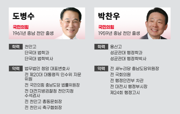 국민의힘 천안시장 후보군 중 박찬우 전 국회의원과 도병수 변호사는 공직·선거 경험이 풍부하지만, 중앙당 공천과 과거 선거 낙선의 그림자가 여전히 부담이다.