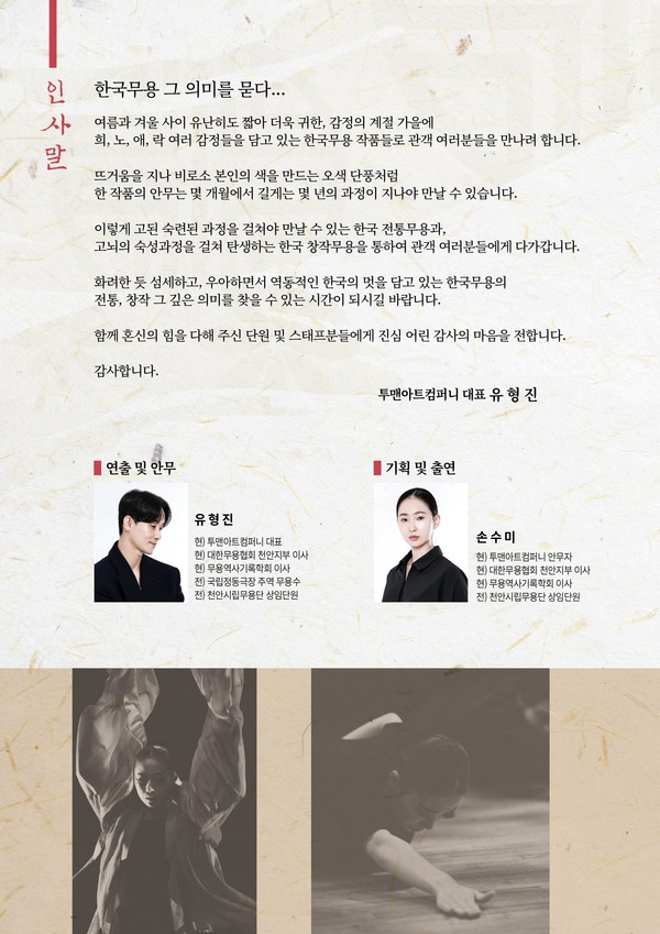 이번 무대는 전통과 현대의 조화 속에서 한국 전통무용의 본질적 의미를 다시 묻는 작품으로, 연출가 유형진, 안무가 손수미가 참여해 예술적 깊이를 더했다.