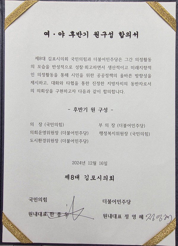민주당은 “양당이 서명한 문서는 김포시의회의 안정적 운영을 위한 책임 있는 약속”이라고 강조했다.