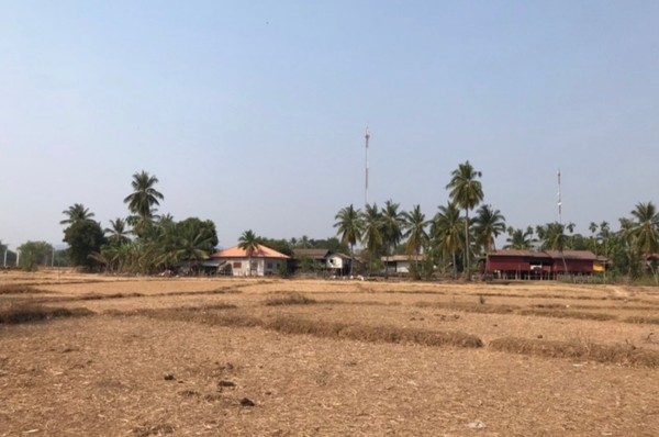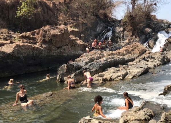 카약을 타고 돈솜에 도착해 추수가 끝난 들판을 가로 질러 작고 아담한 폭포에 도착했다.