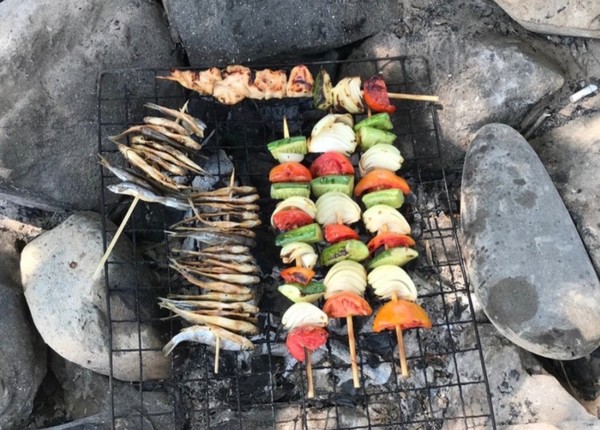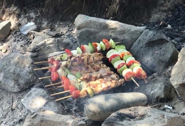 우리 팀은 다른 팀보다 앞서 폭포에서 많이 즐겼기에 폭포를 넘겨주고 점심식사 장소인 자그만 모래사장이 있는 강가로 옮겼고, 미리 도착한 다른 가이드가 닭 꼬치를 숯불에 구우며 점심 준비를 하고 있었다.