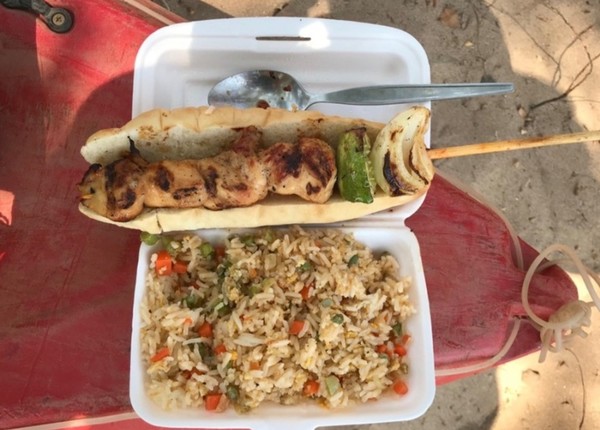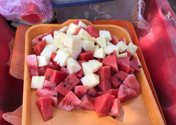 점심 메뉴는 닭 꼬치와 볶음밥, 말린 생선구이와 후식으로 수박과 파인애플이 나온다.