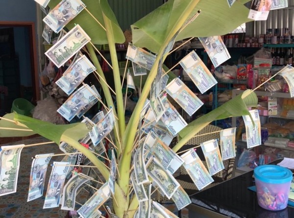 나뭇가지에 지폐를 묶어 크리스마스트리처럼 장식을 하고 있다.