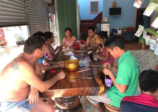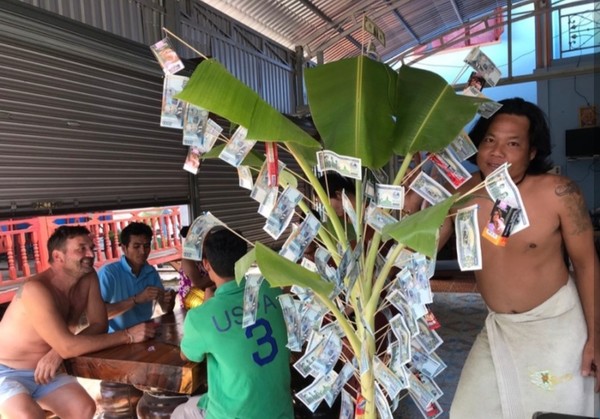 (뉴스코리아=호치민) 이웅연 특파원 = 전날 카약킹으로 피곤해 늦잠을 자는데 시끄러운 음악소리에 잠이 깨어 밖을 나오자 숙소 앞 가게에 사람들이 모여 돈 나무를 만들고 있다.