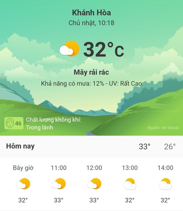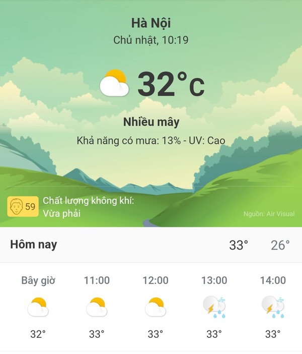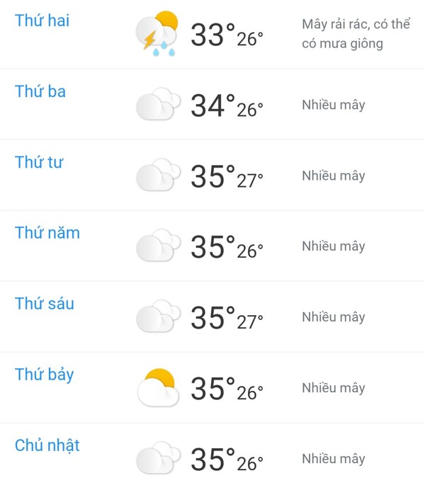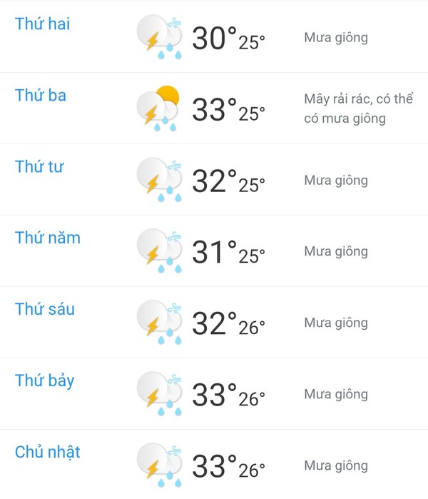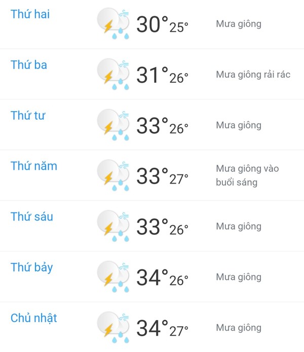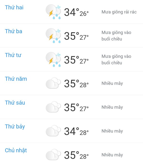 다음은 7월 18일 오늘의 날씨와 7월 19일부터 7월 25일 까지의 베트남 대도시의 한주간 날씨 예보이다.