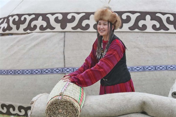 ▲사진 : 키르기스스탄 전통의상을 입고 유목민의 천막집 유르트를 치는 여인  @뉴스코리아 맘라리예바 아이다 통신원