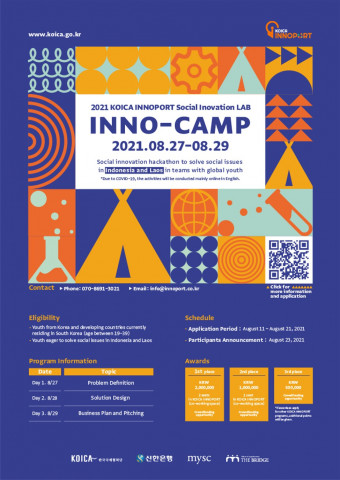 (서울=뉴스코리아) 최신 기자 = 한국국제협력단 KOICA(이하 코이카)가 주최하고 신한은행이 후원하며, 사단법인 더 브릿지(대표 황진솔, 이하 더 브릿지)가 주관하는 인도네시아 및 라오스의 사회 문제 해결 해커톤 ‘INNO-Camp(이하 이노캠프)’가 8월 27일(금)~29일(일)까지 3일간 진행된다.