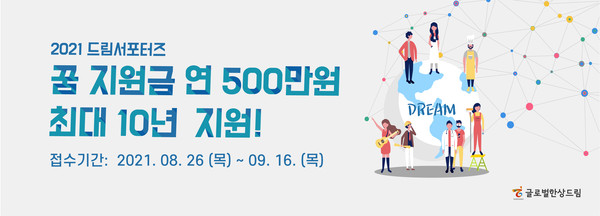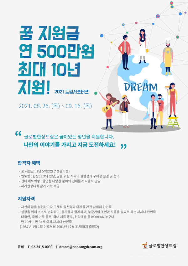 (서울=뉴스코리아) 최신 기자 = 글로벌한상드림은 꿈 지원금 연간 500만원을 최대 10년까지 지원하는 '드림 서포터즈' 차세대 한민족 꿈 지원 사업을 오는 9월 16일(목)까지 접수한다. 지원자격은 자신의 꿈을 실현하고자 구체적 실천력과 의지를 가진 차세대 한민족이면 누구나 지원 가능하며, 내국인, 국외 거주 동포, 국내 체류 동포, 취약계층 등 한민족(KOREAN)중 만 19세 ~ 만 34세 이하 한민족 (1987년 1월 1일 이후부터 2001년 12월 31일까지 출생자)이어야 한다.
