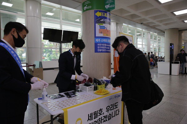JDC는 16일 제주국제공항 1층에서 세월호 참사 7주기를 맞아 안전에 관한 경각심을 되새기고자 제주공항 입도객을 대상으로 노란 리본이 새겨진 마스크를 배부할 예정이다.