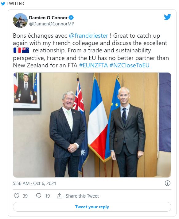 오코너 장관은 유럽 방문의 일정에 따라, 유럽 연합과 뉴질랜드 사이의 자유무역협상의 추진을 위해 파리에서 프랑스의 통상장관과 회담을 가졌으며, 회담을 마치고 유럽 연합의 국기와 프랑스 국기 그리고 호주 것으로 보이는 국기 앞에서 찍은 사진을 트위터에 올린 것이다.