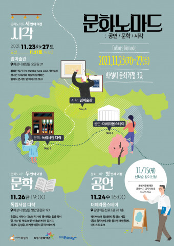 [화성=뉴스코리아) 김성덕 기자 = 화성시문화재단(대표이사 이종원)은 11월 23일부터 27일(경기도 문화의 날 주간)까지 관내 문화 거점 3곳에서 진행되는 ‘문화노마드 : 공연·문학·시각’ 사업에 동행할 시민 신청자를 모집한다.
