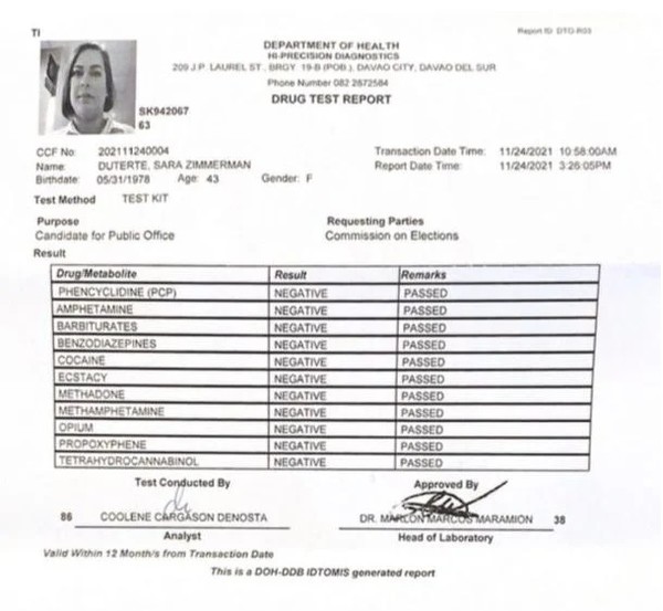 사라 두테르테는 “오늘 마약 검사를 받았다. 물론 결과는 음성이다. 대통령의 주장이 합당하다고 믿었고 봉봉 마르코스 대통령 후보자의 권유도 있었기에 금일 나는 스스로 마약 검사를 받았다. 검사 항목은 코카인, 엑스터시, 메스암페타민등을 포함한 모든 마약류에 대한 검사였다”고 말하였다.