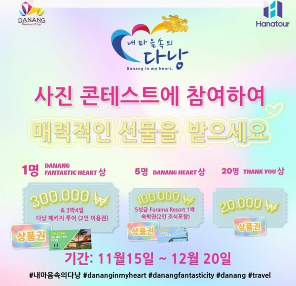 (다낭=뉴스코리아) 김경태 특파원 = 베트남 다낭 관광청은 다낭 여행의 추억을 되살리며 코로나이후 다낭 여행의 붐을 다시 살리기위해 한국인 대상으로 다낭여행 사진을 SNS상에 올려 "좋아요"를 많이 받은 지원자에게 상품을 주는 이벤트를 실시하고 있다.